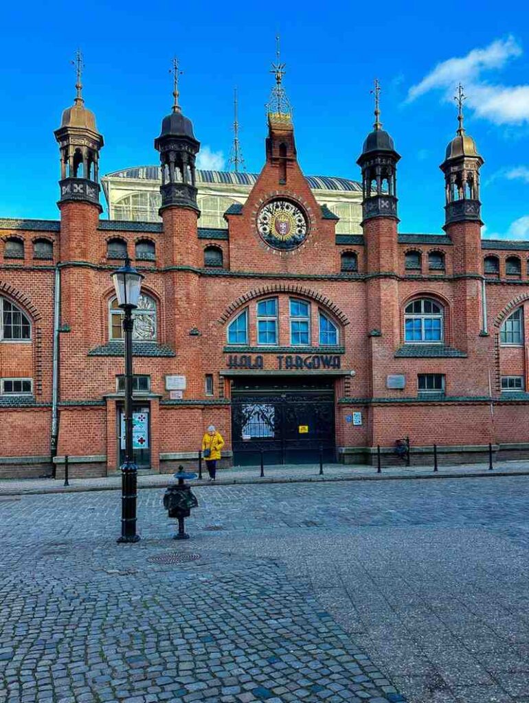 Il nostro secondo giorno si apre sempre all’insegna di un’ottima colazione (sì, anche questo nel prossimo paragrafo, portate pazienza!) per poi tornare su passi già percorsi il giorno prima con maggiore attenzione e soprattutto fermandoci qua e là per qualche acquisto. A Danzica si trovano infatti tantissimi negozi di souvenir, più o meno tradizionali, con diverse proposte per tutte le tasche, ma mediamente convenienti. Ci siamo spinte fino al celebre mercato coperto Hala Targowa, Google lo dava come chiuso temporaneamente, ma volevamo constatare di persona. In effetti è in fase di ristrutturazione ed è un vero peccato (ad oggi, fine agosto 2025 è ancora chiuso), ma vale la pena comunque vederne la facciata.